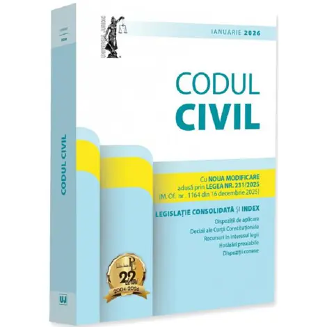 Ediția a 26-a (revizuită) a lucrării, Codul civil: ianuarie 2026, îngrijită de prof. univ. dr. Dan Lupașcu și tipărită pe hârtie albă de calitate superioară, include noua modificare adusă prin legea nr. 231/2025 (M. Of. nr. 1164 din 16 decembrie 2025).