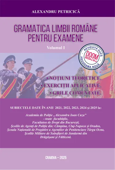După fiecare capitol sunt evidențiate cele mai frecvente dificultăți întâlnite, cu scopul de a semnala aspectele problematice specifice părților de vorbire sau tipurilor de propoziții. Volumul include, de asemenea, subiectele care au fost propuse, explicate și comentate la examenele susținute în anii 2021, 2022, 2023, 2024 și 2025 la Academia de Poliție, Facultatea de Drept București, Școlile de Agenți de Poliție din Câmpina, Cluj-Napoca și Oradea, Școlile Militare de Subofițeri de Jandarmi din Drăgășani și Fălticeni, precum și la Școala Națională de Pregătire a Agenților de Penitenciare din Târgu Ocna.