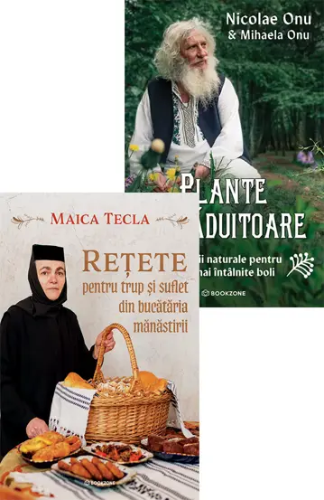 Două feluri simple și vechi prin care omul s-a îngrijit dintotdeauna: hrana curată și puterea vindecătoare a naturii. Rețetele Maicii Tecla sunt născute din pacea mănăstirii, din grija pentru semeni și din credința că o masă bună poate aduce nu doar sațietate, ci și liniște. Apoi descoperi lumea Vraciului Nicolae Onu, în care plantele, rădăcinile și darurile pământului sunt privite ca ajutor real pentru omul slăbit, obosit sau în căutarea echilibrului. Împreună, aceste două cărți te întorc la rădăcini.