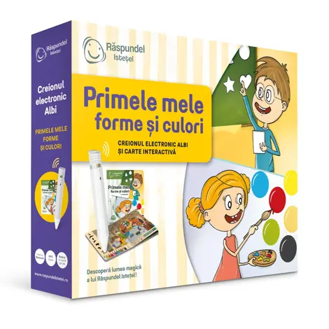 Pachetul contine creionul vorbitor ALBI si cartea Primele mele forme si culori. Lumea inconjuratoare contine o multime de forme si culori. Sara si Tom, fratele ei, te vor invata despre forme si culori cu ajutorul obiectelor pe care le intalnim zilnic in jurul nostru. Stii ce culoare se obtine daca amesteci rosu si albastru? Ce forma are un fagure? Ce este o silueta? In aceasta carte, vei gasi toate raspunsurile si multe altele. Alatura-te prietenilor tai, Sara si Tom! Vom merge impreuna cu cortul, il vom vizita pe vecinul lor magician si ne vom distra impreuna cu ei la balci! Peste 2100 de sunete si texte. Varsta recomandata: 2+ ani
